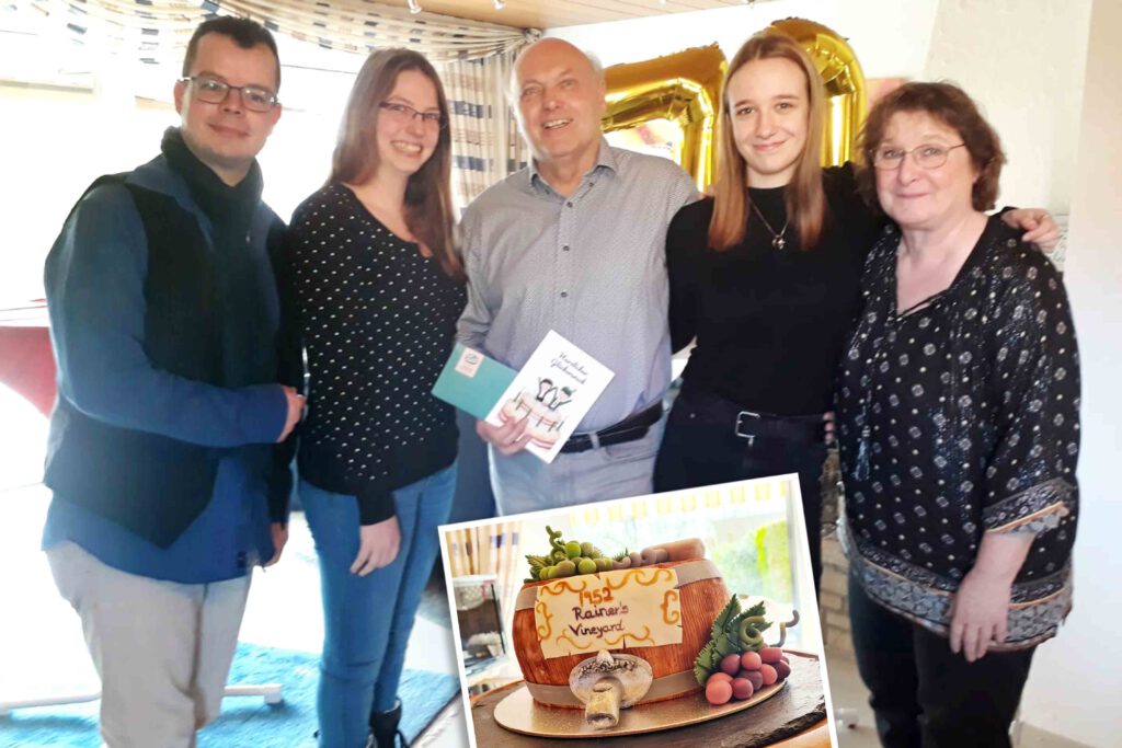 Am 2.2. hatte unser Geschäftsführer Rainer Weis seinen runden 70. Geburtstag. Der geschäftsführende Vorstand sowie unsere Majestäten statteten ihm am Vormittag einen Überraschungsbesuch ab. Massig Geburtstagskarten zierten Schränke und Tische im Wohnzimmer. Mitten im Raum stand die von Gisela Weis organisierte und in Szene gestellte Torte in Weinfass-Optik. Nach einer kleinen Stärkung überreichte unsere Abordnung Rainer einen Geburtstagskuchen und einen Gutschein „Vom Fass“.